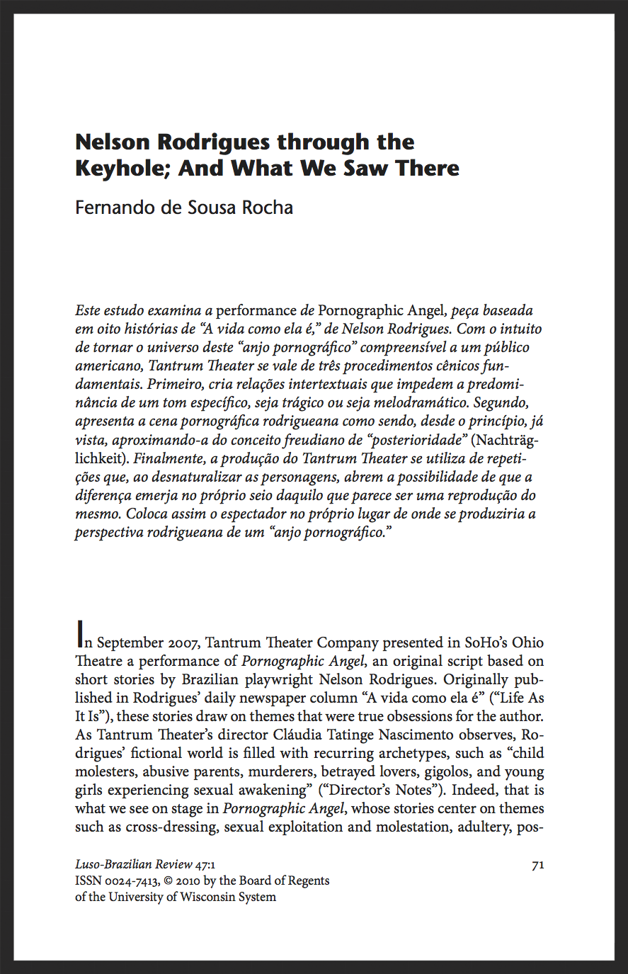 Review. “Nelson Rodrigues Through the Keyhole; And What We Saw There.” Fernando de Sousa Rocha. Luso-Brazilian Review47:1 (2010). 71-88.